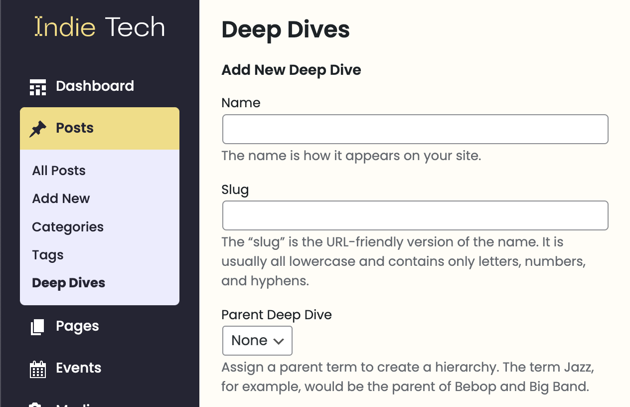 By default, Indie Website comes with two taxonomies: Categories and Tags. Custom Taxonomy, such as Deep Dives are available for publishers on Grow and Scale. Please reach out to Indiegraf Support to help setup a Custom Taxonomy for you.