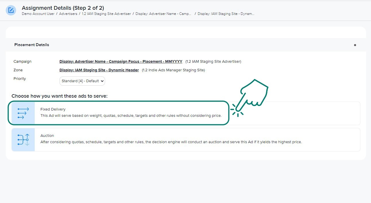 Choose how you want to serve the ads, you can serve them by Fixed Delivery or by Auction