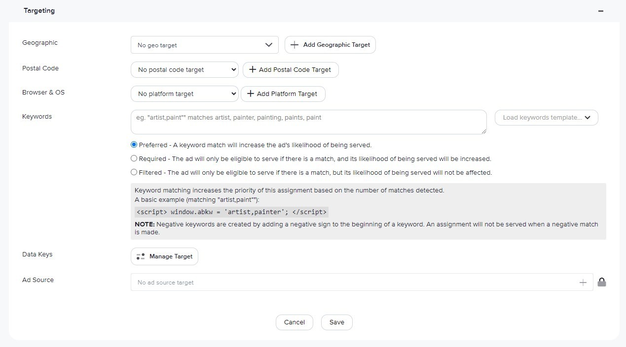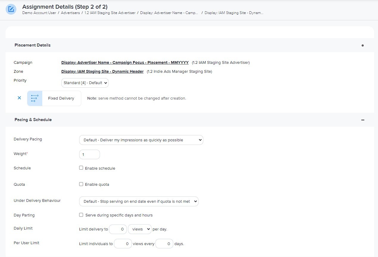 Once you determine how to serve the ads, you can include information about Pacing & Scheduling, Frequency Capping, and Targeting
