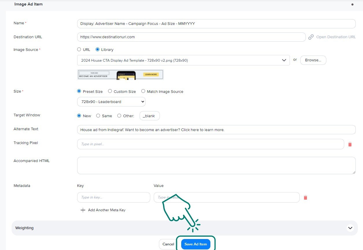 You can include additional information like alt text, tracking pixels, metadata, and more but the most important fields are the name, destination URL, and the creative/size
