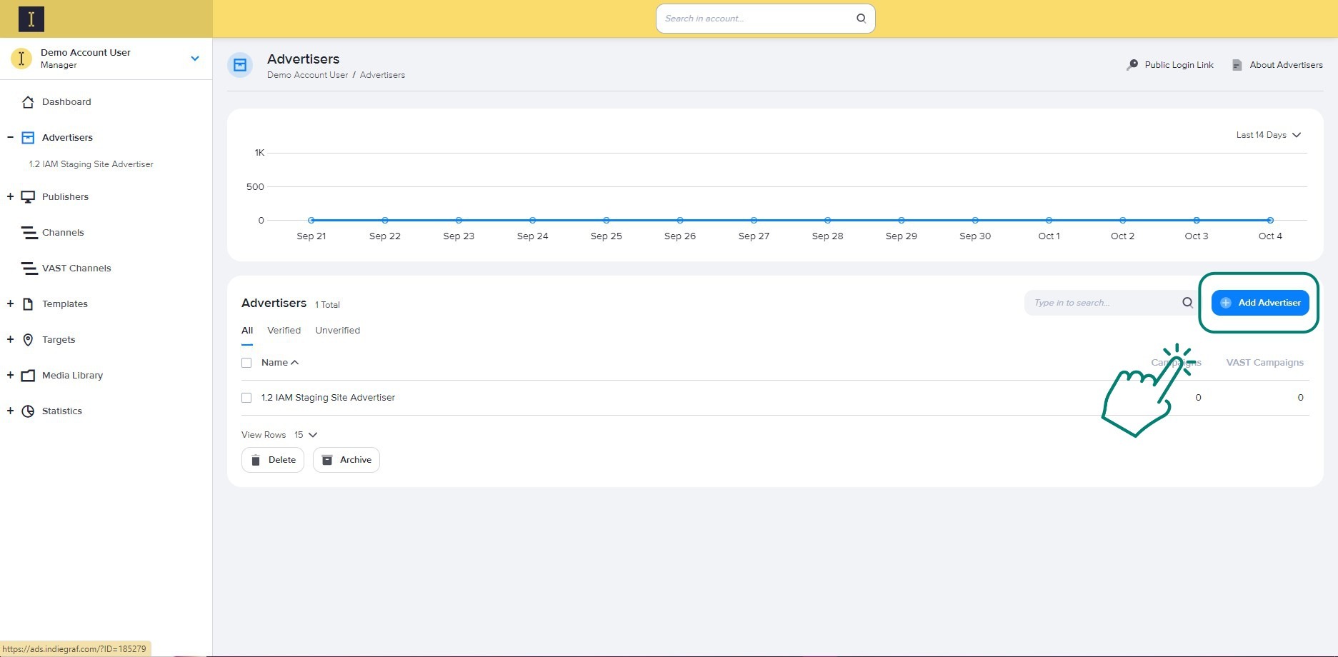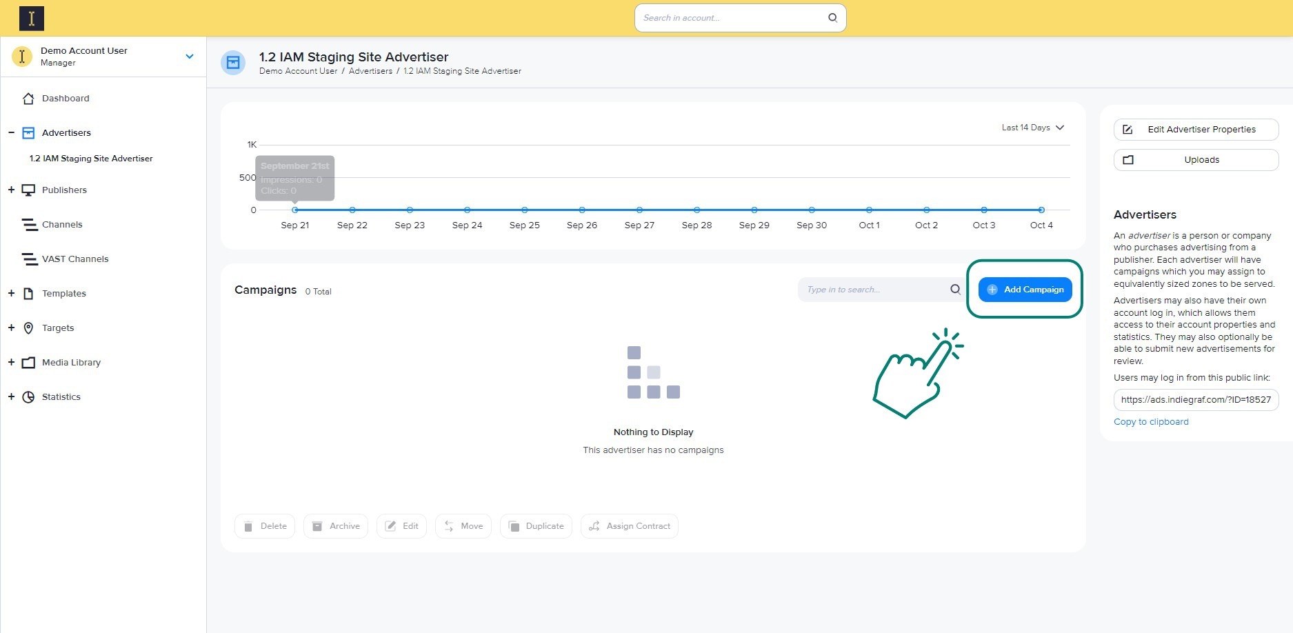 Advertisers can be any source of advertisement. For most advertisers, the best way to serve ads is by grouping ad items into campaigns. If you need to add a new advertiser, simply click on Advertisers and select Add Advertiser.