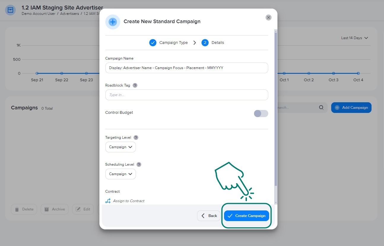 3. Name the campaign, i.e. [Ad Type] - [Advertiser] - [Campaign Focus] - [Placement] - [MMYYYY]